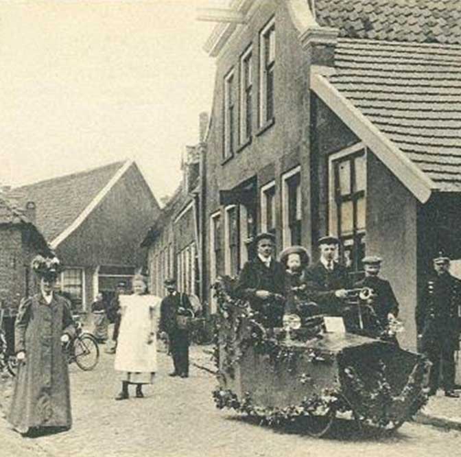 Dwarsstraat te Ootmarsum, 1930. Marinus Johannink legde de laatste hand aan het prachtige pand. Het linkerdeel van de winkel richtte hij in als de iezer kaant: een ijzerwarenwinkel. Ook kon men er terecht voor wild(producten) - zoals konijnen, fazanten-eieren en kievitseieren - én werden er in de winkel ter plekke patronen gemaakt voor het jachtgeweer. Het middelste deel van de winkel diende als warenhuis, oftewel de zeute kaant. Rechts in het pand woonde de familie Johannink. Vandaag de dag is het unieke pand nog steeds een kenbaar onderdeel van Ootmarsum. Maar inmiddels in een modern jasje!
